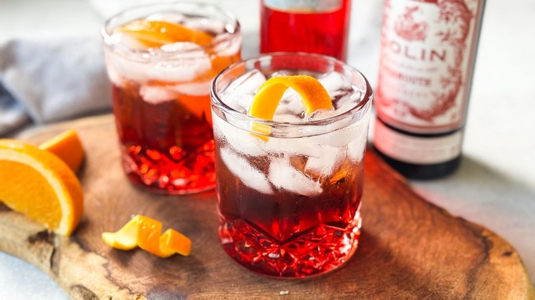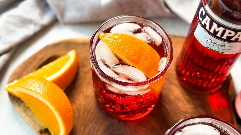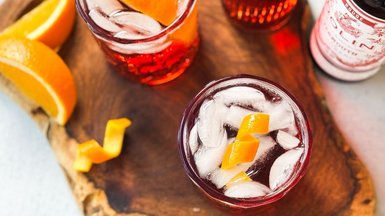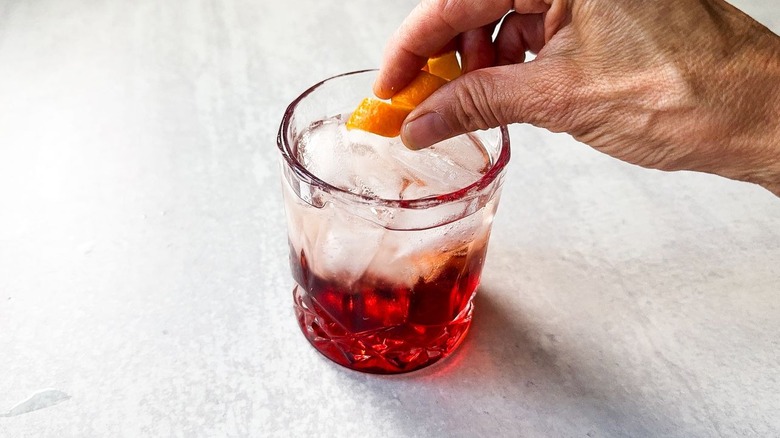 Another interesting garnish to entertain is using a sprig of rosemary or thyme with the orange wedge. Rosemary adds rich savory herbal notes to contrast the sweetness of a squeeze of orange, while thyme would add a fresh and earthy taste. Kinnaird says that her favorite way to switch up this cocktail, however, is by using fresh blood orange and a blood orange ginger beer. This may seem like quite a departure from the original, but the ginger beer adds just a bit of extra sweetness along with a punch of ginger and blood orange flavor to complement the liqueurs. Top with a wheel of blood orange for a super elegant Americano twist.