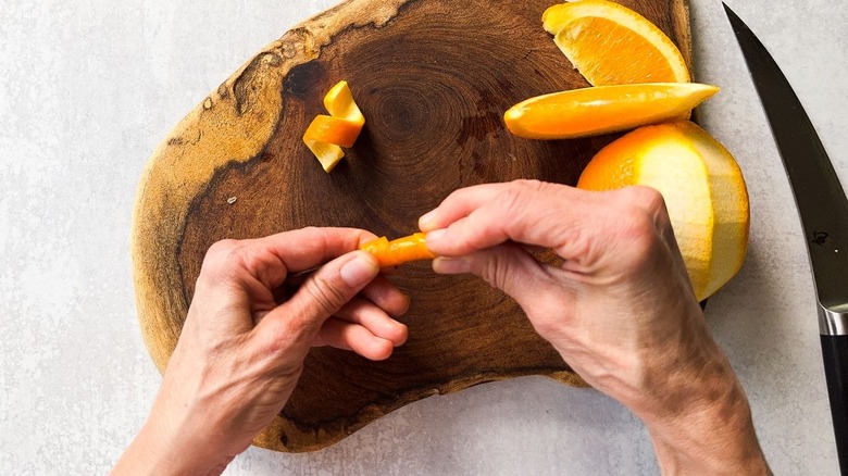 - Alternatively, cut a long strip of orange peel using a thin knife and curl the strip into a twist.