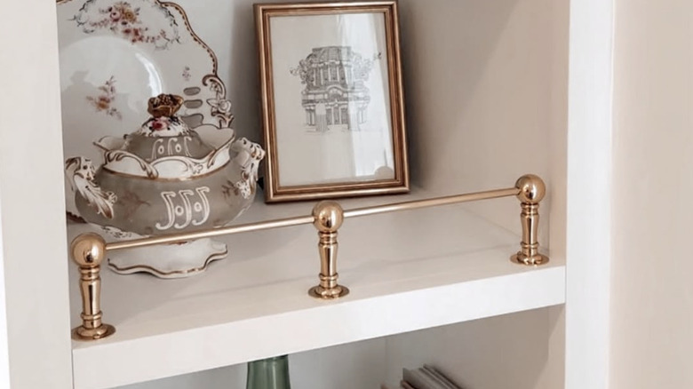 If you have small kitchen shelves, you can go with an even easier idea: towel bars. Take a towel bar and lay It on top of the shelf, then screw the towel bar in, so it lays flat. From the front, the towel bar gives the appearance of a gallery railing. Make sure to secure the towel bar to the shelf the same way you'd secure it to a wall; towel bars tend to be light, and it could move around or fall off while you're reaching for plates. You can even find affordable, sophisticated options like this one from Kokisiri on Amazon for right around $30. With cabinets being the most expensive part of a kitchen remodel, open shelving is a great way to open up the space — and can save you money.