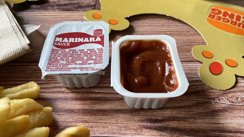 Coming in last in my little lineup is Burger King's marinara sauce, which I immediately identified as the ultimate catfish after the very first smell and taste of its obvious deception. Though the container clearly says otherwise (it does say marinara, right?), the condiment is merely ketchup posing as marinara. That realization became even clearer when I took a quick glance at the ingredients list. With distilled white vinegar, sugar, corn syrup, and tomato paste, the ketchup connection is undoubtedly strong and straightforward.