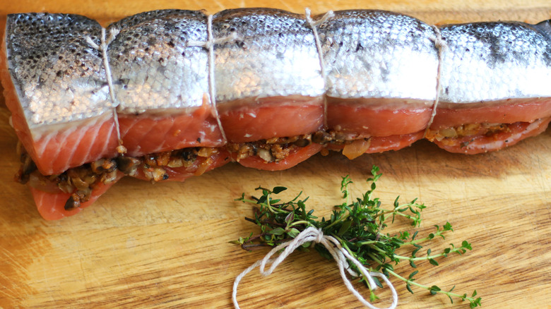 Salmon is, truly, one of the finest fish out there as far as chefs are concerned. It's delicious, with meaty, fatty flesh that has a delectably soft texture when cooked properly, and a rich aroma that's unlike any other fish (apart from, perhaps, trout). It's versatile, too — from a perfectly baked salmon side to crispy-skinned pan-fried fillets to sushi: Any way you can think of preparing fish, you can do it with salmon. One particularly delicious method is stuffing your salmon for a luxurious, yet surprisingly simple, meal that'll be sure to impress (or just make for a hearty weeknight dinner).