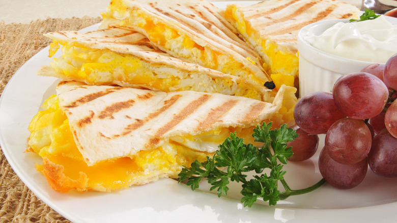 Many of us remember our first semester away from the family kitchen, unsure of how to shop on a budget. Don't be alarmed: We've got a list of smart grocery buys to help you avoid the impending headache. And since bread tends to go bad quickly, we recommend tortillas instead — they're cheap, college-friendly, and ideal for lunch, dinner, and, in this case, breakfast. The ingredient can be used to make some really inventive meals, and it's also a cheap way to establish a base for an affordable and tasty morning meal. If you've been feeling stuck as a result of limited budgets and soaring grocery prices, fret no more — for this recipe, you'll be making a cheesy breakfast quesadilla.