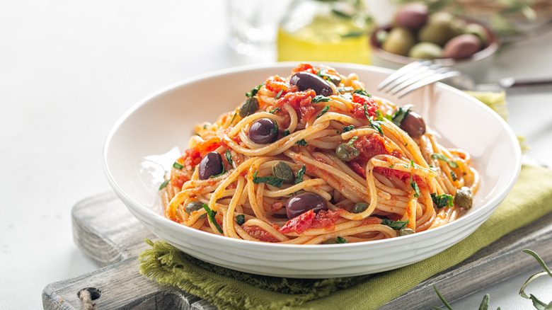 Adding these two ingredients might not seem like a revelatory trick, as after all, puttanesca is one of many Italian pasta classic sauces that already features olives and capers in a seasoned tomato sauce. Though puttanesca is a sauce of its own, stirring in chopped olives and capers also offers a solution to level up bland or even balance overly sweet tomato sauce with their natural salty bite for a more well-rounded sauce. This ingredient combo is also suitable for plant-based eaters, as traditional puttanesca sauce also includes anchovies in the mix. For a kick of umami to take the place of anchovies, consider stirring in miso paste for a robust tomato sauce, every spoonful of which can transport your tastebuds to a sunny Mediterranean coast.