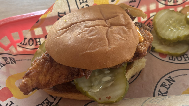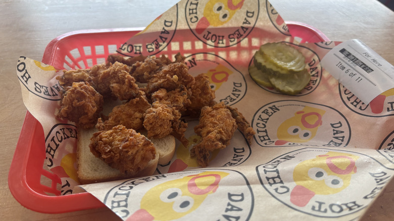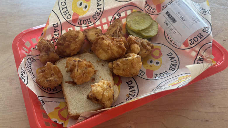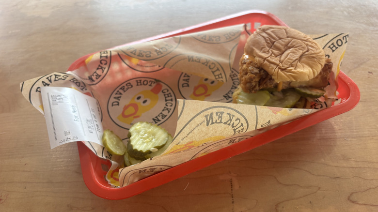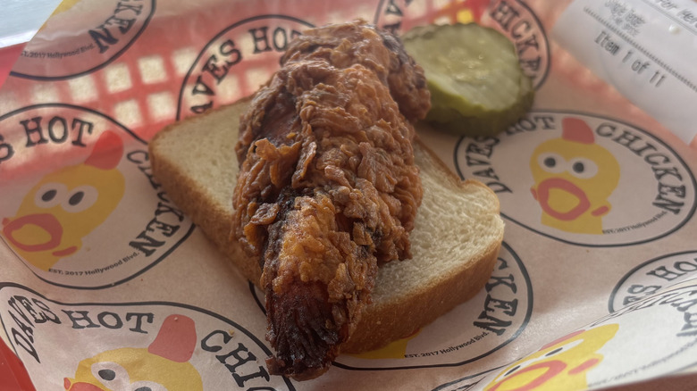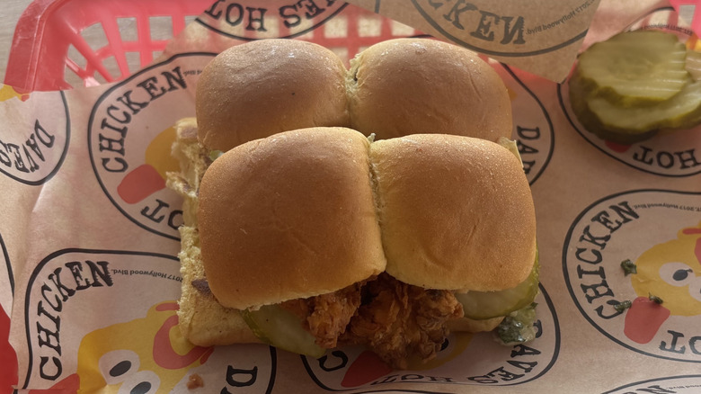 Not for nothing, but Dave's slider bun is second to none. It's perfectly cooked yet still moist and chewy, ideal for absorbing all the heat, sauce, and pickle juice a slider will throw at you. Sure, you get a slice of white bread with your tender, which allows you to make your own slider hack by folding the tender into the slice, but it isn't quite the same. That's one of the reasons the mini slider doesn't rank higher, there's less of everything, including that well done bun.