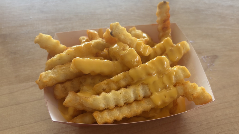 As noted above, Dave's Hot Chicken's fries are a crinkle cut above many of its fast food competitors. Unfortunately, the cheese sauce upgrade provided by Dave's Cheese Fries takes the side dish in the wrong direction, making for a soggy mess lacking in both flavor and texture. Although the fries themselves may suffer under the weight of Tender Bites, Dave's signature sauce, kale slaw, and pickles, at least it isn't lacking in textures and flavors.