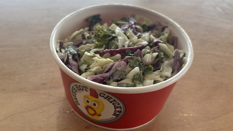 The light and fruity aspect has to do with a couple of factors. First, although mayonnaise is a part of the recipe, Dave's doesn't try to drown its slaw in it like many fast food cole slaws. Second, that fruitiness comes from the inclusion of apple cider vinegar, which is odd — without knowing the source, you might identify the sour note as citrus. The kale makes for a good crunch, too.