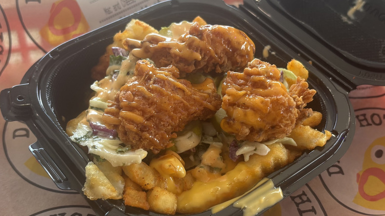 Dave's Hot Chicken began with $900 and a parking lot, serving Nashville Hot chicken fingers off a cart back in 2017. Word of mouth and an Eater Los Angeles review helped Dave's turn into a success, with an initial brick and mortar location becoming 329 locations nationally by 2025. Late to the henhouse compared to its competition, it makes up for it with a success story everyone can relate to and a laser-like focus on the chicken finger as a meal-builder. It also has a cauliflower alternative, some side dishes, shakes, and frozen drinks in the mix. Here is a ranking of the lion's (or rooster's) share of its menu items, from slightly "afowl" to "best bang for your cluck."