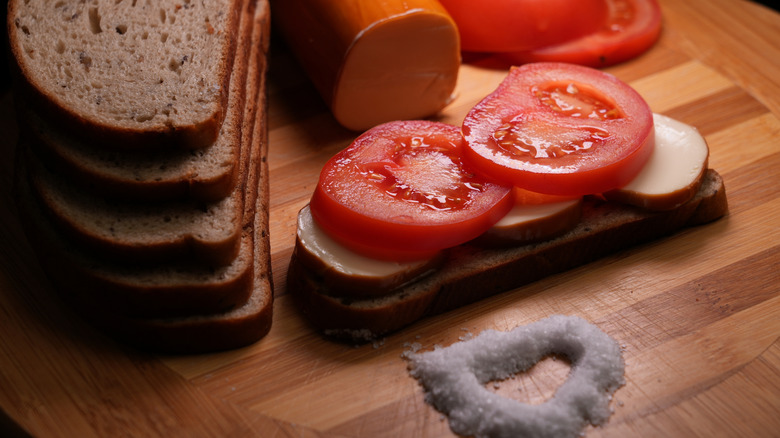 Improperly prepared tomatoes can have the opposite effect on your otherwise promising handheld meals. Merely slice and stack, and the slick disks are liable to slide around unmanageably and even soak your carefully selected bread and fillings, diluting any actually intended condiments in the process. This is because great, ripe tomatoes are so wonderfully naturally juicy. But that juice is better kept for your bloody Marys, so you'll want to allocate a little extra time to drawing out that otherwise valuable liquid. And you can do so with a little sprinkling of the salt that you probably already have in your pantry.