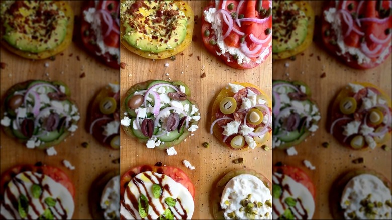 Of course, this is just one direction your flight can take. You can also base your slices on iconic dishes such as a BLT sandwich or a Caprese salad, using mozzarella, basil, and balsamic. Or, you can sub your bagel for a tomato slice and top it with cream cheese, lox, and sliced red onion. Other toppings, such as deli meat, burrata, and cottage cheese are also popular. Really, there is an infinitum of ways to top your tomato slices. Don't be afraid to get creative.