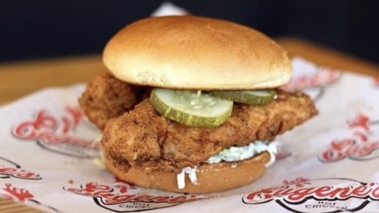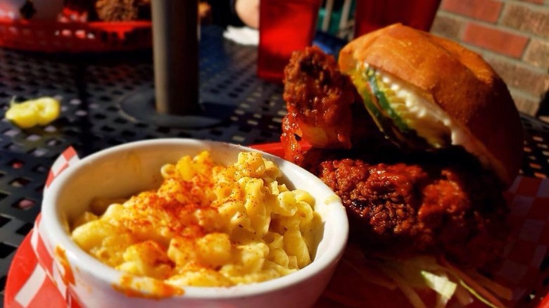 Eugene's Hot Chicken is an Alabama institution. This joint specializes in a mean chicken tender sandwich that customers have been raving about for years. While chicken sandwiches weren't among Elvis' favorite Southern comfort foods, we think they should have been. According to Eugene's menu, its chicken sandwich comes in a slew of different heat levels — from Southern (no heat) to hot (touch of burn) to stupid hot (for the bold and daring) — that'll really test the strength of your palate. Accompaniments like coleslaw, french fries, as well as kickin' collard greens and cornbread tie this whole sandwich experience together.