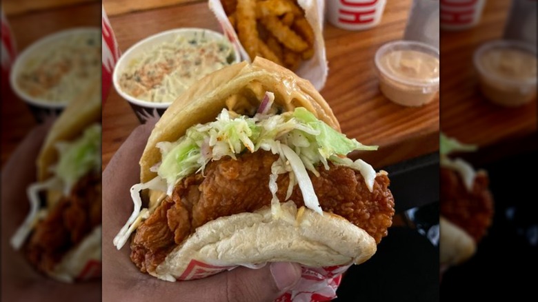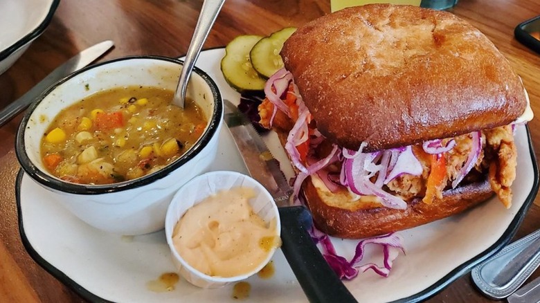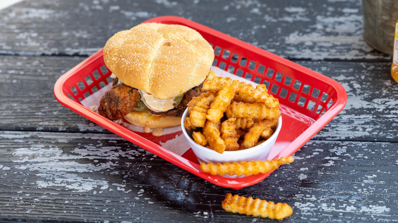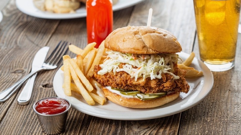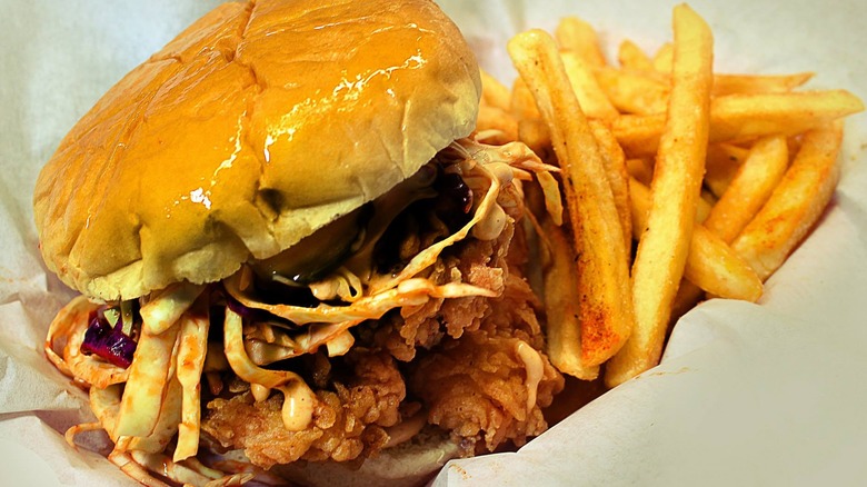 This cajun- and creole-inspired eatery gets high marks from loyal customers as well as out-of-towners, thanks to its one-of-a-kind crispy chicken sandwich. Those who've had it enjoy its generous size, along with how its ingredients go together in harmony. Screen Door Eastside's Crispy Chicken Sandwich is made up of a fried chicken breast, dabbed in mayonnaise, surrounded by pickles, and topped off with coleslaw — all sitting on a toasted bun. Each sandwich comes with an order of french fries for a full meal.