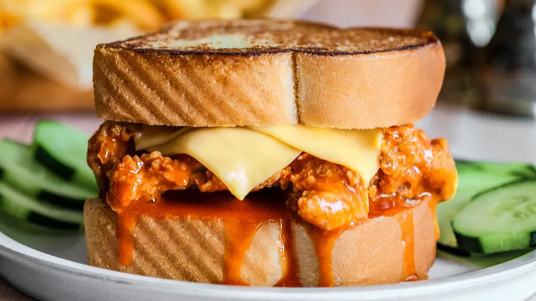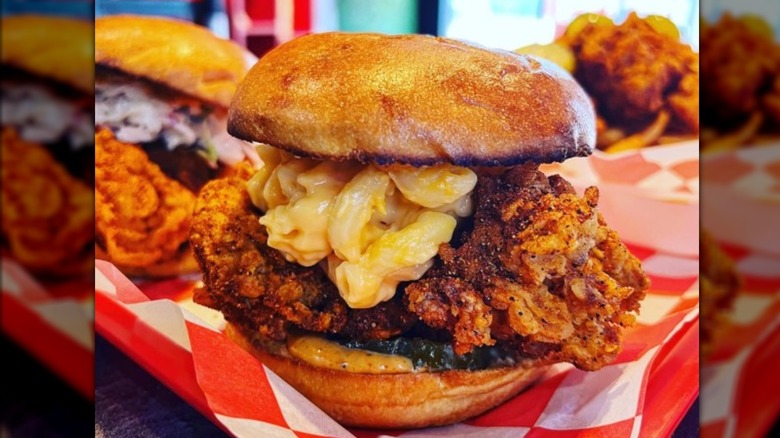 Flaming Kuma's stock in trade is applying Korean flavors to corn dogs and chicken sandwiches. With regard to the latter, be on the lookout for its Mac N Cheese Chicken Sandwich the next time you're in town. Though it can be a bit messy-good, customers heap praise on its flavor profile: not overpowering the chicken, but allowing for the delicious Kuma sauce to shine through. With each bite, you'll get hot chicken, mac and cheese, pickles, and Kuma sauce on a brioche bun.