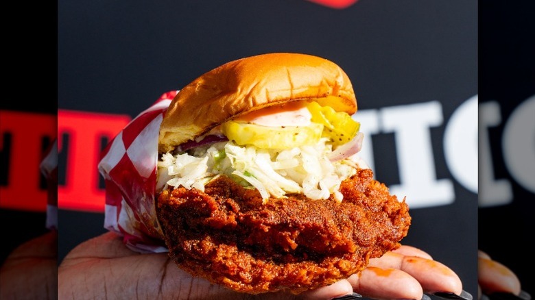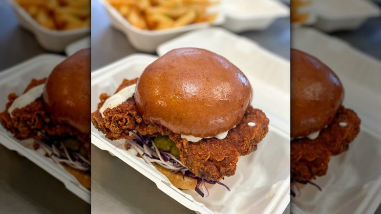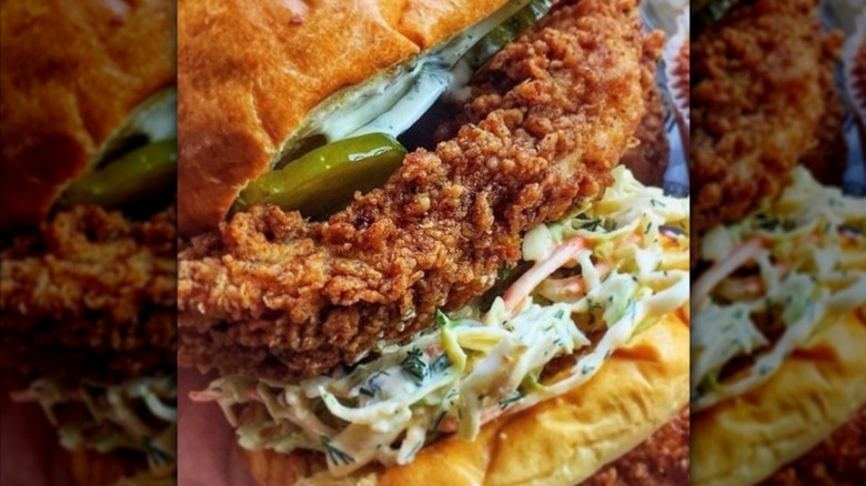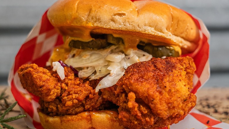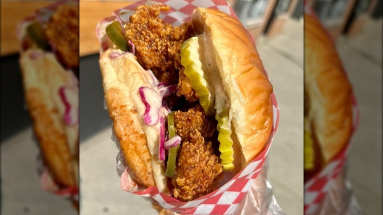 If you're living in or about to visit the DMV — the District of Columbia, Maryland, and Virginia area — then Wooboi Hot Chicken deserves a stop on your itinerary. Fans of hot, fried, chicken sandwiches call the chicken sammies this establishment serves up the best in the entire DMV. They praise the juiciness of the chicken, the tang of the pickles, and the refreshing taste of the slaw. Order The Sando, and you'll get a big fried chicken breast, butter pickles, cider slaw, and comeback sauce, all nestled in a bun.