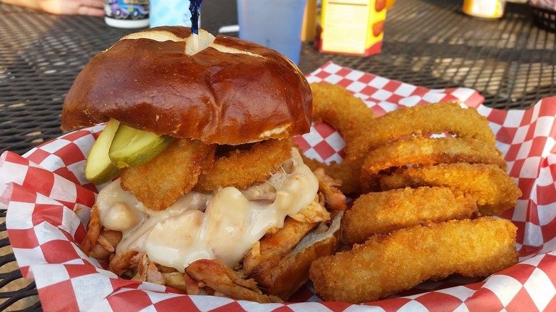 If memorable names alone can bring in clientele, then The Goose Sandies & Bar's Whirligig Chicken Sandwich takes the top prize. Diners have come to love this establishment's interpretation of a chicken sandie. You get fried chicken, in-house hot honey, a smattering of Duke's mayonnaise, iceberg lettuce, provolone, and pickles. Those who've eaten here tend to describe it as light on grease and full of tender chicken, exhibiting good crunch. It's taken to another level, thanks to the inclusion of Duke's mayonnaise.