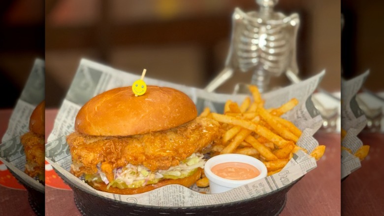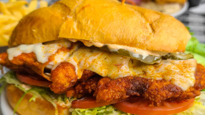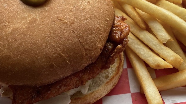 You've likely heard of the Looney Tunes cartoon character Foghorn Leghorn, but Chubby's Hot Chicken has put a spin on this by naming a chicken sandwich after this character. Its Fog Horn Leg Horn Sandwich is made up of Nashville hot chicken, pickles, and jalapeño slaw and then topped off with a satisfying sauce. Customers dig this taste medley, with some praising the chicken's tenderness and flavors, along with the way the jalapeño slaw complements the heat of the chicken.