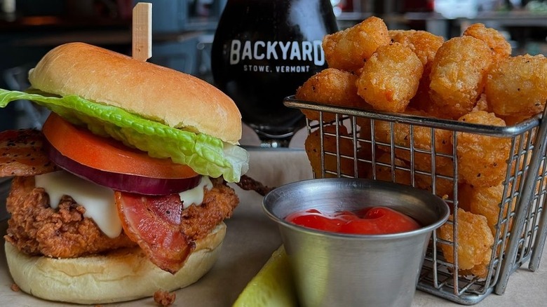 When folks in the Green Mountain State get a hankering for a chicken sandwich, they head to Backyard, the spot for sandwiches and burgers. Backyard's Fried Chicken Sandwich delivers the right hint of a kick, to hear the patrons describe it, in addition to being a palate pleaser. Fried chicken teams up with black pepper bacon, onion, tomato, lettuce, and two sauces: chipotle ranch and a housemade cheese sauce. That's stacked high on a potato bun and served with a pickle and kettle potato chips.