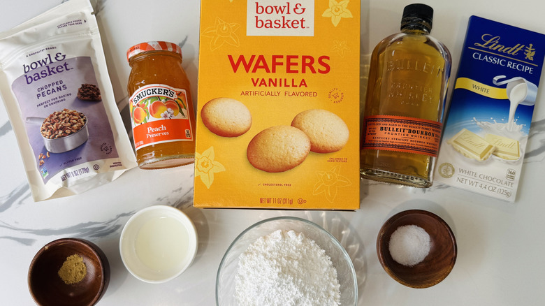 To make these peachy bourbon balls, you'll need vanilla wafer cookies, pecan pieces (toasted), confectioners' sugar, peach preserves, bourbon, and kosher salt. If desired, get ground ginger to add to the mixture, and melted white chocolate, crushed pecans, or shredded coconut for coating.
