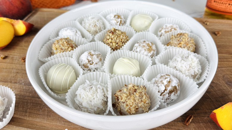 Aside from their delicious taste and bite-sized format, one of the advantages of bourbon balls is that they can be made in advance. "Bourbon balls can easily be made ahead and refrigerated or frozen depending on how long you plan to store them," Rosenhouse states. If you want to get a head start on your baking tasks for an event or simply want to have an extra treat on hand, these peachy bourbon balls are the way to go. Their eye-catching appearance and easy-to-grab size make them a great option for potlucks, parties, or any other occasion when you want to share something sweet with a crowd. They also make a nice gift if attractively packaged, and pair well with an assortment of cookies and other sweet treats.
