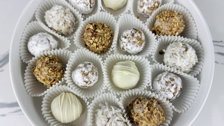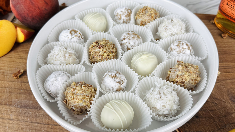 Meanwhile, pecans are part of the original concoction, but Rosenhouse says you can leave them out or swap in a different nut if desired. Of course, these peachy bourbon balls require peach preserves, but if you want to stray from the recipe, Rosenhouse says, "Substitute any jam or preserves in the place of peach, and add spices as desired." Let that inspire other fruity combinations and try tasty pairings like apple and cinnamon, raspberry and almond, apricot and pistachio, or even fig preserves with walnuts. Although bourbon balls get their name from the liquor in question, try your hand at rum or whiskey balls for a novel variation.