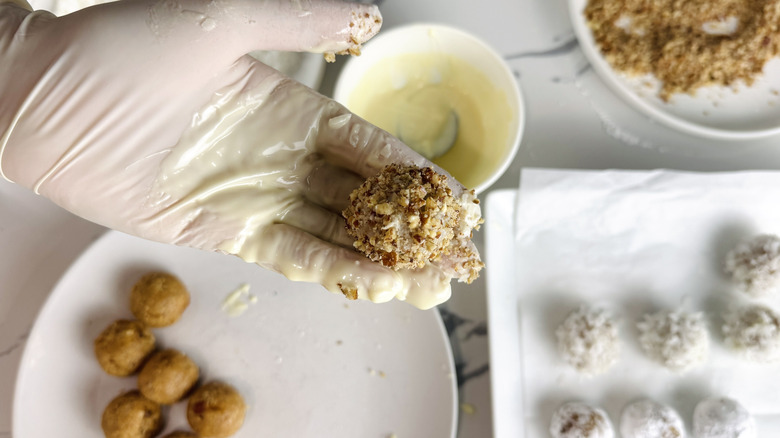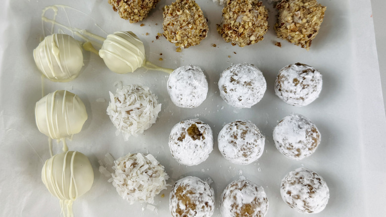 For optimal results, Rosenhouse instructs, "Prep as directed, coating the balls with any toppings you prefer, and transfer them to an airtight container to keep them from bumping around." You can store them in the short term or slightly longer term, depending on your needs, as they'll keep in the fridge for up to a week or in the freezer for around two months. If they're frozen, Rosenhouse recommends leaving them at room temperature to thaw before serving.