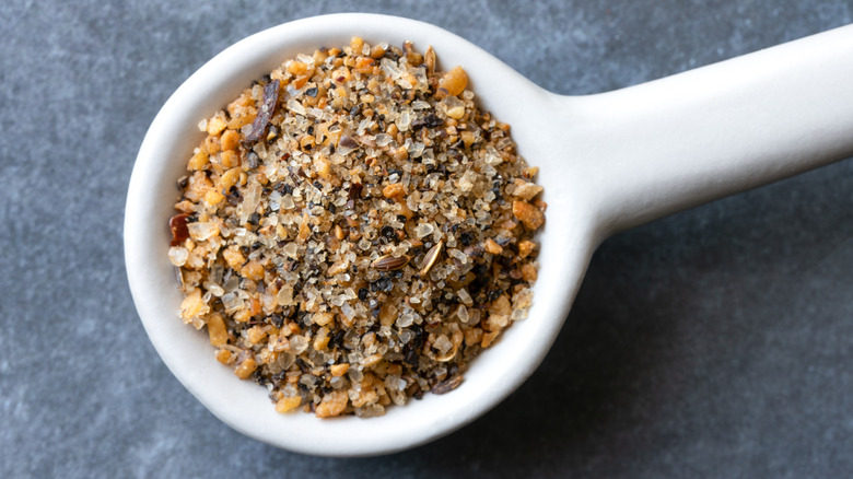Putzing around on Sunday mornings calls for a mean steak and eggs, a breakfast icon that's ridiculously filling and decadent. But if you don't have the red meat? Turns out, steak seasoning makes a killer addition to fried eggs, too. It might not be the standard choice, but a basic steak seasoning, at its core, mainly consists of classic table spices you'd embrace for a rib-sticking breakfast, including salt, pepper, garlic, onion, and paprika. Additionally, robust and peppery steak seasoning has good textural payoff, and reinforces the lacy edges eggs get when fried on the griddle-top.