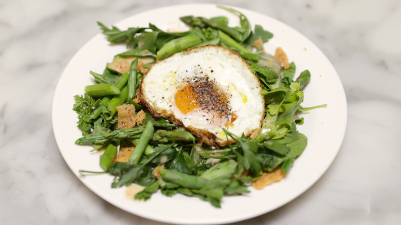 Truffle tends to show at the end for a final, show-stopping effect. You can lightly garnish your plate with truffle shavings upon frying your eggs to the desired consistency. Obviously, getting your hands on real truffle mushrooms might not come as easily as other delicious seasonings. Your next best bet is truffle oil. High temperatures, some argue, can strip the oil of its potency, so you might consider treating your eggs to a light drizzle once they've heated to completion. And whatever you do, consider opting for brown butter as your cooking fat — the combo is simply divine.