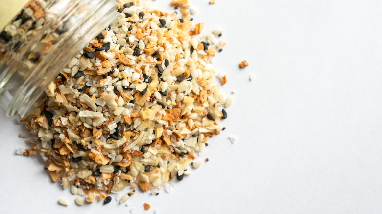 Assuming you're frying eggs for a protein-packed avocado toast, you're likely anticipating a nice garnish to tie it together. Try Everything Bagel seasoning. This speckled seedy blend sounds odd, but it's exactly the ticket to jazzing up your morning breakfast. It's composed of the crunchy tidbits affixed to a real Everything Bagel — poppy and sesame seeds, garlic, and kosher salt — and unlocks a strong blast of flavor when incorporated into plainer dishes. Nothing is more effortless than sizzling your egg and, once cooked, dusting on the salty-crispy goodness to make it even more magical.