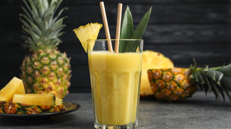 A trip to a Disney theme park isn't complete without a Dole Whip, and it's been that way ever since the creamy pineapple soft serve's 1984 debut. Years later, the fruity, non-dairy dessert has also been offered outside of the parks as a generic "pineapple soft serve" available at fro-yo chains, small town ice cream shops, and even college cafeterias. Grocery stores began selling officially branded Dole Whip in 2023, and today, you can even buy dry Dole Whip protein powder to get that Tiki Room feeling after you've hit the weight room. But that branding comes at a cost, $49.99 for 25 servings to be precise. Thankfully, it's as easy as throwing a couple ingredients into a blender to duplicate a Dole Whip protein shake for a lot less money.