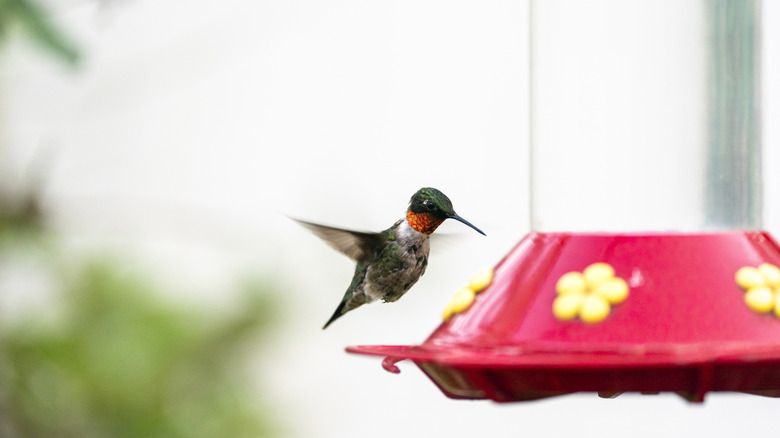 If you want a garden full of these tiny birds, it's important to know what upsets them. Hummingbirds are attracted to bright colors, but that's what the feed is for — never add red dye to hummingbird food because it can potentially make them sick. Plus, avoiding dye means the sugar-water mixture is clear, just like regular nectar.