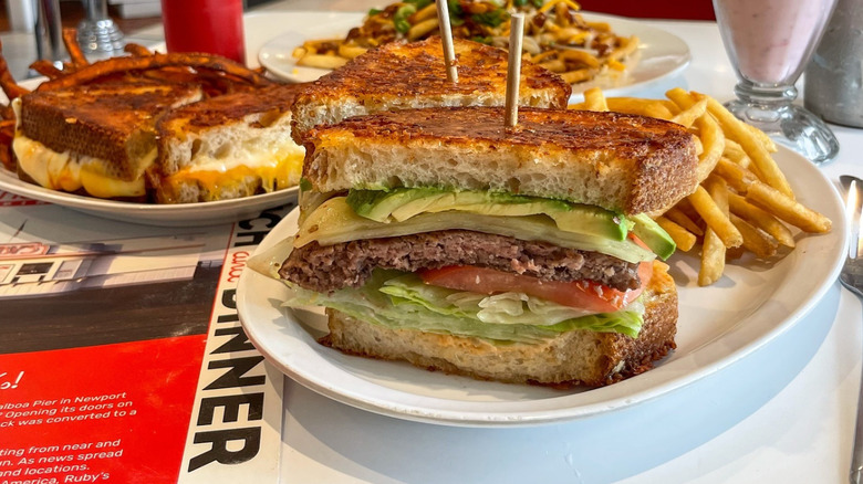 Your meal at Ruby's could start with one of the chain's famous milkshakes in flavors like vanilla, strawberry, or Oreo cookies and cream. Then you can tuck into breakfast dishes like omelets, buttermilk hotcakes, and cinnamon french toast. The lunch and dinner menu includes all-American diner fare like burgers, hot dogs, and the classic clubhouse sandwich with fries.