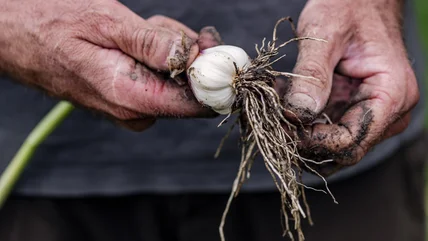 When planting garlic, many people wonder if you can plant grocery store garlic to grow your own, and though the answer is technically yes, Bovshow cautions against it. "Store-bought garlic may be treated with chemicals to prevent sprouting or could carry diseases that could infect your garden," she says. While certified seed garlic is the best choice, it's not your only option. "I've been pretty lucky though planting bulbs from organically grown garlic from my local farmer's market!" Bovshow tells us.