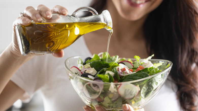 Whether you tend to stay on top of new health trends or you're just curious about whether you can enjoy your favorite olive oil by the tablespoon, many wonder if it's okay to enjoy a bit of olive oil on its own. Chowhound spoke to Andrea Soares, Registered Dietitian at Top Nutrition Coaching, to get the details on if it's ever a good idea to take a shot of your favorite oil.