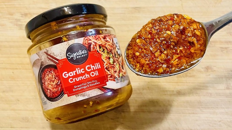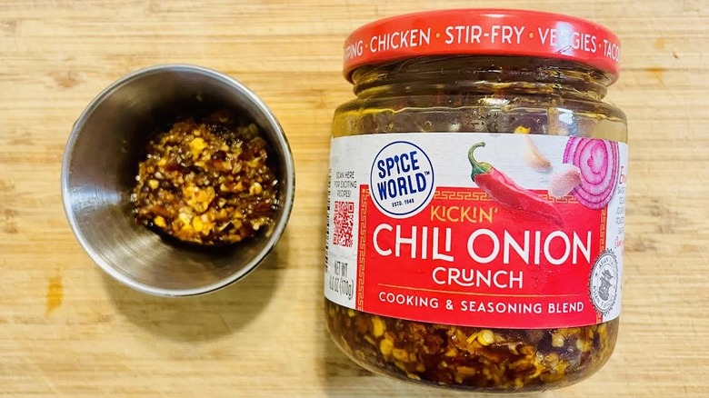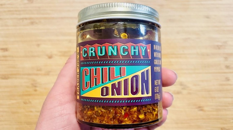 The first chili crisp to breach the top three is none other than Trader Joe's Crunchy Chili Onion. If you've never had the pleasure of trying it before, this is your sign to snag a jar the next time you are at Trader Joe's. A six-ounce jar only costs $4.49, and the low price is just the start of what makes it an amazing pick.