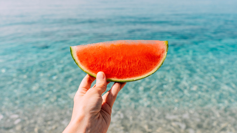 "Easily the most hydrating fruit is going to be watermelon," Pelitera revealed. This is probably not a huge shocker, considering water is literally in its name. This gorgeous summer fruit comes in strong with 92% water content, leaving other options in the dust. Watermelons also deliver about 640 milligrams of potassium in just two slices, which could give your cells an extra boost while giving you that much-needed refreshment.