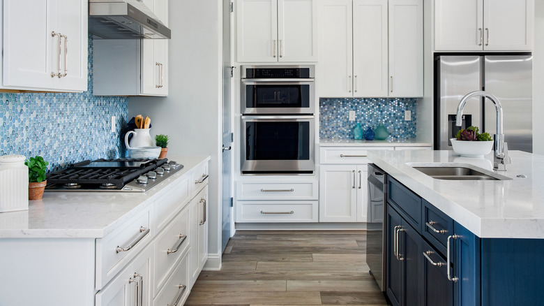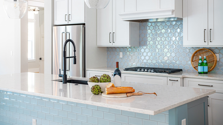 For those who never paid much attention to their kitchen backsplash, this surface is what you often find on the wall behind the sink or oven and underneath the top level of cabinets. It has a functional use in protecting walls from water damage and grease stains, but it's also a star player in interior design by providing a change in color and texture that can match the aesthetic you want. For a crisp, coastal backsplash, try something blue, green, teal, or white.