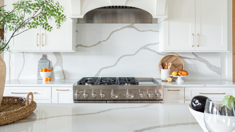 Last but not least, focus on your countertops to get that full "Something's Gotta Give" kitchen. We recommend a white or light gray marbling design, which goes beautifully with white, gray, wood, or blue cabinets. If you need to save some money and can't afford marble countertops at the moment, you can always buy a laminate peel-and-stick cover in the meantime.