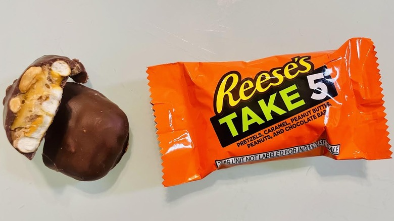 When you need a little more from your chocolate peanut butter candy than just the namesake ingredients, Reese's Take 5 has you covered. Instead of your run-of-the-mill peanut butter candy, it's a candy bar full of caramel, pretzel, and peanut butter. Thanks to the inclusion of pretzels and caramel, it takes the typical peanut butter candy standard and turns it up a notch. The saltiness of the pretzels and caramel pairs perfectly with the peanut butter and chocolate. The blend of crunchy and creamy is fantastic as well. Altogether, every bite is deliciously packed with a wonderland of flavors and textures.