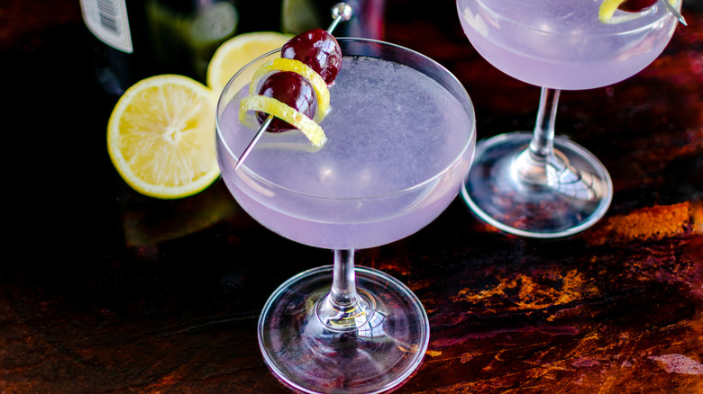 If you haven't had an Aviation before, you can easily recognize it on any bar top from its beautiful purple hue. The crème de violette, a floral liqueur flavored with violet flowers, provides its signature color. Beyond its color, the liqueur provides the cocktail with a lovely floral sweetness that pairs beautifully with the maraschino liqueur's kick of slightly bitter cherry notes. The two of these ingredients together create a unique and balanced cocktail that transforms what a simple gin and lemon could be into a drink with a more sophisticated edge.