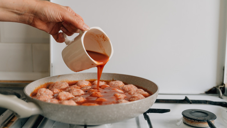 Just because this meatball variation is a vintage recipe doesn't mean you can't bring it up to speed with some modern twists. Some methods suggest tomato sauce, while other quick-fix options call for cooking your meatballs down in tomato soup. To add a bit more texture, you could also add some cheese overtop or serve crispy garlic bread on the side.
