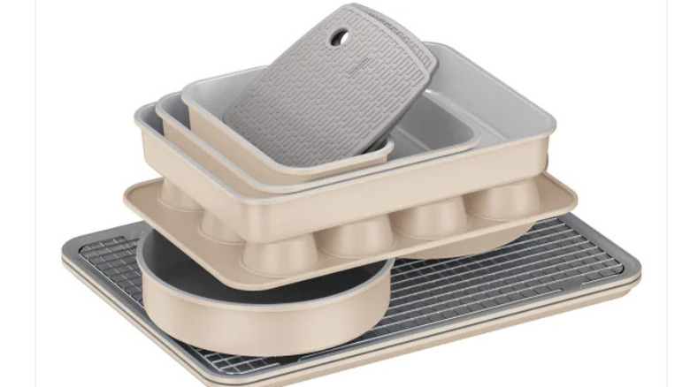 The products are made of aluminized steel, and the interior is PFAS-free, ceramic nonstick, so you don't have to worry about leaving any chunks of cake behind when you pop out your layers. Reviewers love that the pans distribute heat evenly, and storage is a breeze since most of the pans can nest within one another, so you don't have to deal with the leaning tower of pans in your cabinets. It's also a steal of a price with 11 pieces for only $59.99. Comparable sets from other sites can have price tags in the hundreds.