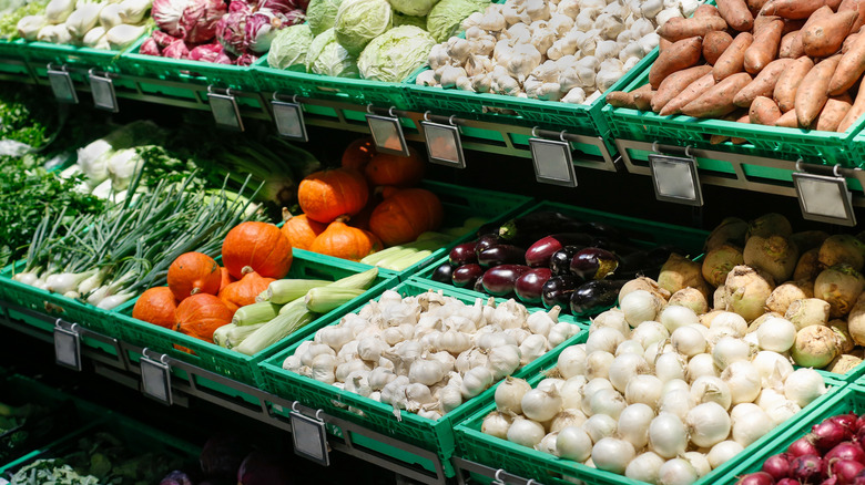 Garlic is one of those ingredients that most home cooks take for granted. At any given moment, it's safe to say, most people have one or two bulbs rolling about one or another corner of their kitchen counter, or tucked into a veggie bowl watching the steady ebb and flow of less hearty ingredients come and go. Unlike many selections in the produce aisle, garlic has a relatively long shelf life. In fact, if you are able to store your garlic in the correct way, your bulb can stay good for anywhere from three to six months at a stretch. However, this is contingent on proper storage methods and no, not just any old shelf will do for your garlic. So how should this allium be stored?