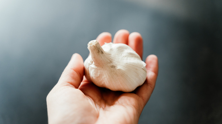 There are also times where garlic is not safe to eat. If your garlic has an unpleasant odor, has spots of mold, or is mushy, those are signs that you really ought to toss your garlic out. In general, it's better to be safe than sorry when choosing whether or not to take a risk on that bulb of garlic. And just remember — do not put your garlic through a garlic press, lest you incur the wrath of Alton Brown.