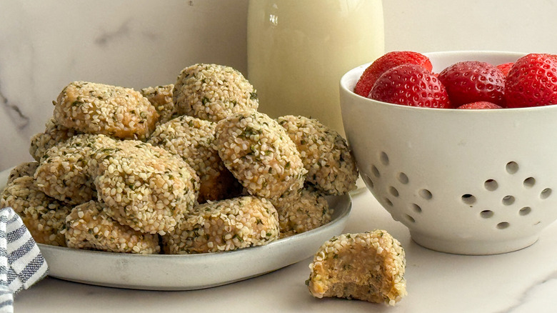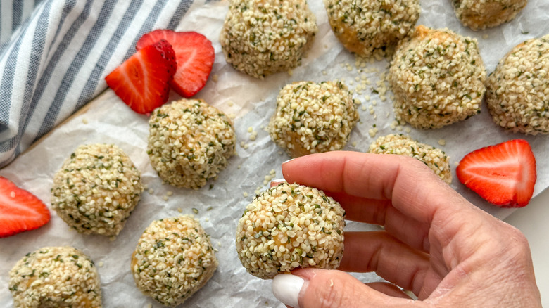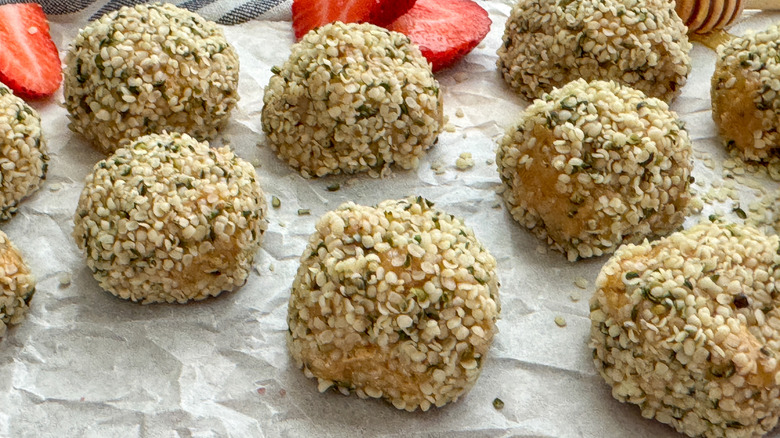 - Roll the mixture into 20-22 balls, roll each in the remaining hemp seeds, and place them on the prepared baking sheet.