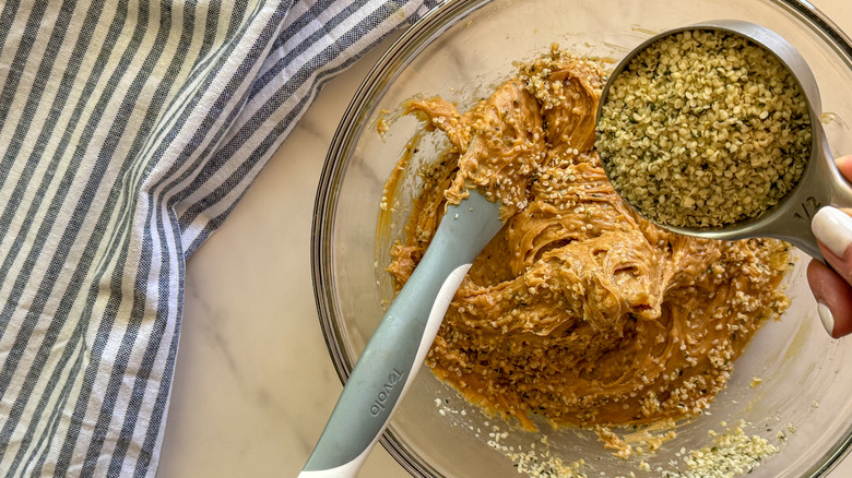 - Add 1 cup of the hemp seeds and stir to incorporate.