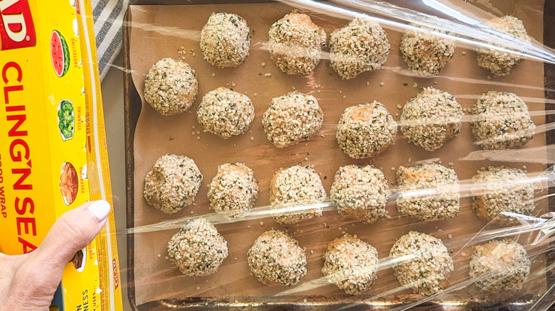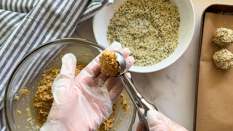 Roll the mixture into 20-22 balls, roll each in the remaining hemp seeds, and place them on the prepared baking sheet.