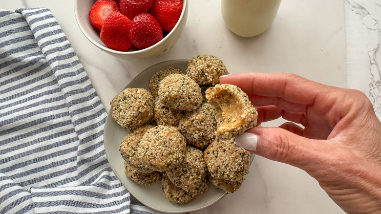 If you like to have a stash of snacks and are limiting processed foods, you're probably always on the lookout for something that's simple, fresh, nutritious, and easy to make. Look no further — these soft and chewy peanut butter balls are calling your name, and you can whip them together without even getting out the food processor or heating up the oven. Loaded with nutrients and protein, these balls boast only 3 ingredients: peanut butter, honey, and hemp seeds. They are rich and sweet, with great texture from the hemp seeds, which offer a gentle crunch that contrasts nicely with the creamy peanut butter. The honey brings a sweet note of caramel that deepens the flavor of the treats. After you make your first batch, you might find yourself making these peanut butter balls on repeat.
