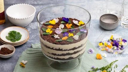 The decoration of this grown-up dirt cake is where you really get to have fun, so feel free to bring out your inner child and get creative. Rye uses edible viola flowers as a dainty and colorful cake topper, but you can use a wide variety of fresh, edible flowers from apple blossoms to lavender or nasturtiums to create a colorful garden of your own. To extend the garden theme, green sprinkles or dyed desiccated coconut can be used to simulate grass, and, to go all out, you can make your own moss by making a simple microwave mug cake using green dye, then breaking up the green sponge to resemble clumps of moss. Meringues or marzipan styled as mushrooms would add a lovely woodland finish to your dessert, pairing well with the green moss.
