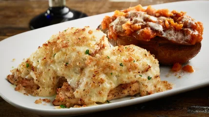 The Parmesan Crusted Chicken at LongHorn Steakhouse is super-satisfying, and it's easy to order gluten-free. All you have to do is ask your server to omit the breadcrumbs from the chicken. You'll still get two delicious grilled chicken breasts covered in a Parmesan and garlic cheese blend (with a side of your choice), but without any of the gluten. When it comes to sides, there are a ton of gluten-free options, including a baked potato, sweet potato, seasoned rice, loaded potato soup, shrimp and lobster chowder, and more.