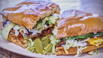 When it comes to filling your torta, you've got tons of options. Mexican culinary innovators are constantly developing new torta styles, and you can customize recipes based on your own tastes. Pepito tortas — popular in Mexico City — are loaded with marinated grilled flank or skirt steak and topped with fresh avocado and well-seasoned refried beans. In the mood for a Cuban twist? A torta Cubana is piled high with bacon, chorizo, roast pork, ham, cheese, avocado, and refried beans. If you don't mind getting your hands dirty, the pambazo offers a unique, spicy take on the torta. Before the bun is piled high with potatoes, chorizo, cheese, and crema, it's dipped in salsa and fried on a griddle (think a spicy, savory version of the Monte Cristo sandwich).