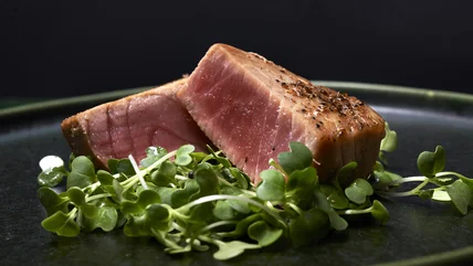 The first steps to success, she explains, happen at the grocery store and then with prep. "Always start with a good-quality tuna steak, ideally about 2–3 cm thick, so it stays juicy inside," she recommends. Once you're home, pat the steak dry with kitchen paper and lightly coat it in olive oil to help it crisp up. She also recommends seasoning it well. "A good mix of salt, pepper, garlic powder, or even a little soy sauce and lemon juice works beautifully," she says.